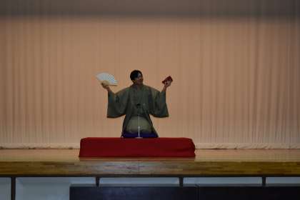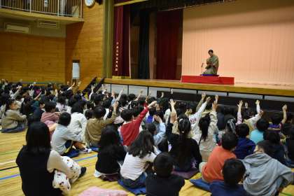 落語家の林家 木りんさんをお招きして、落語体験教室を実施しました。「身長や体重が大谷翔平選手と同じ。今日は、大谷翔平選手が太子堂小に来たと思ってね。」「落語の始まりは、曾呂利新左衛門という元スパイの話が面白くて、豊臣秀吉にたいそう気に入られてお伽衆になったことなんだよ。落語家は、元スパイということになるね。」などと気さくに子どもたちに話してくださり、子どもたちの心を引き付けていました。また、落語は、扇子と手ぬぐいを使って表現することを教えてくださいました。