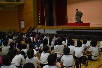 落語家の林家 木りんさんをお招きして、落語体験教室を実施しました。3・4年生は、まず、扇子と手ぬぐいを使ってピザを食べたり、釣りをしたりしている様子を見せていただきました。その後、代表児童が自分で考えて演じているのを皆で当て合いました。最後に、落語「動物園」を鑑賞しました。大いに盛り上がりました。