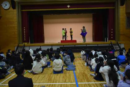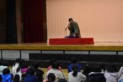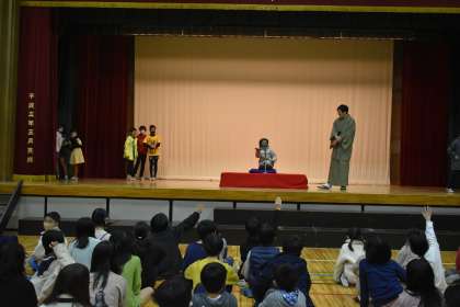 落語家の林家 木りんさんをお招きして、落語体験教室を実施しました。5・6年生は、「皆の考えた落語が新しい落語として後世に残るかも知れないよ。」との言葉に気をよくして、すすんで舞台に上がり、扇子や手ぬぐいを工夫して使い、自転車での宅配や金魚すくい、表彰式の様子などを工夫して表現していました。最後に、落語「動物園」を鑑賞しました。