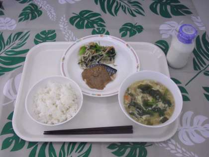 本日の給食『ごはん・さばのごまだれかけ・野菜の辛し醤油あえ・かきたま汁・牛乳』