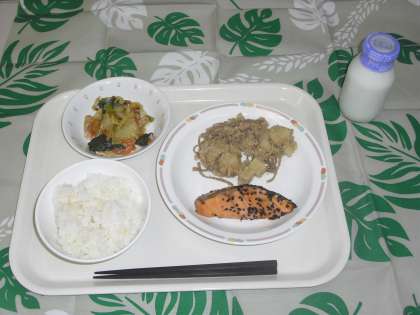 本日は食べ物と健康についてお話します。好きなものを好きなだけ食べているとどうしても偏ってしましいます。今日のような和食は栄養のバランスがよく、健康づくりにとてもよいと思います。給食は残さずに食べることで栄養のバランスが整い、食べたことがない物や苦手な物も、ひと口食べることで、「今まで食べられなかったけれど、食べてみたら美味しかった。」ということはよくあります。是非、食べず嫌いをなくし、チャレンジしてください。(保健美化給食委員会 昼の放送発表より)