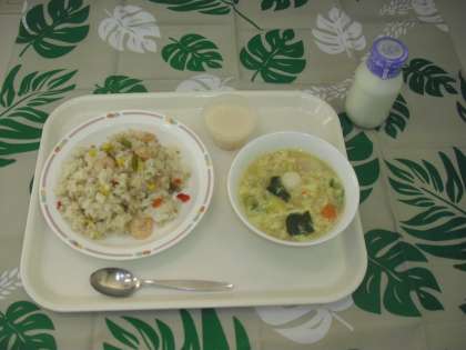 本日のメニュー『ナシゴレン・白玉スープ・杏仁豆腐・牛乳』