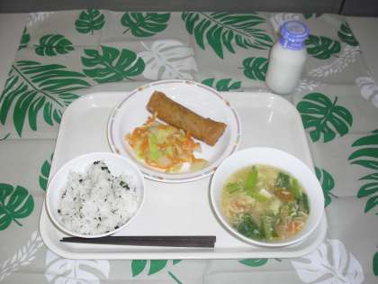 3月6日(火)の給食 『わかめとじゃこのごはん・春巻き・ラーパーツァイ・中華風コーンスープ』
