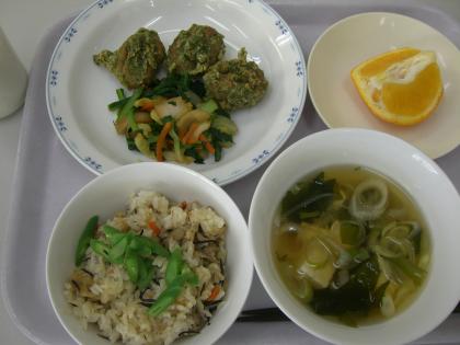 五目ごはんの中には、ひじきが煮びたしには小松菜が、さらに牛乳がつきます