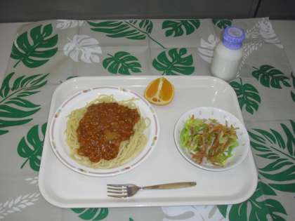 本日のメニュー『スパゲティミートソース・ハニーサラダ・清見オレンジ・牛乳』