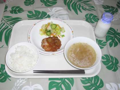 本日のハンバーグには「おから」が入っています。豆腐を作る時の副産物ですが、タンパク質、脂肪、窒素、繊維など栄養的に優れています。