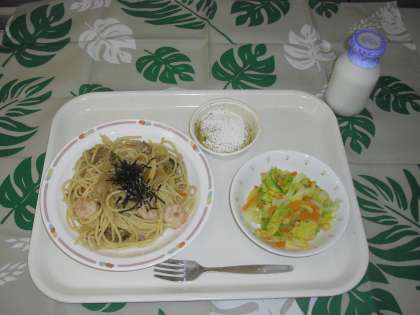 4月24日(火)メニューは、和風スパゲッティー、コーンサラダ、シナモンポテト、牛乳です。