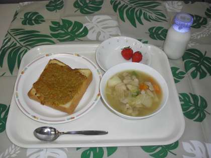 5月2日(水)メニューは、ドライカレートースト、白いんげん豆の田舎風スープ、いちご、牛乳です。