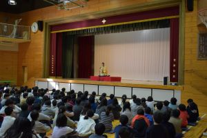 1月13日(土)体育館で落語鑑賞教室が行われました。1.2.3年生に「オウム」と「みそ豆」のお噺、4.5.6年生には「牛ほめ」のお噺をしていただきました。特技の津軽三味線もご披露いただきました。体育館は子どもたちの笑顔でいっぱいになりました。落語家の林家ひろ木さん、ありがとうございました。保護者の皆様もご参観ありがとうございました。