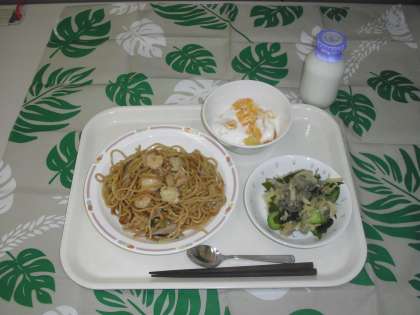 5月8日(火)メニューは、五目焼きそば、じゃこサラダ、フルーツヨーグルト、牛乳です。
