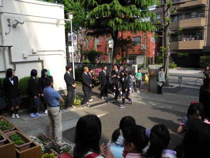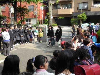 5月8日(火)、太子堂中学校でふれあい挨拶デーを行いました。今回は小学生が中学校に行って挨拶を行いました。いつもとは違って賑やかな正門の様子に、ちょっと照れくさそうな中学生たちでした。