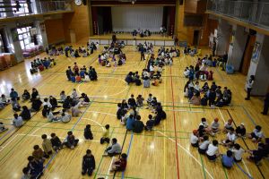 2月9日(金)朝の集会で「ゴロゴロドン!」を行いました。クラスの列ごとに輪になってゴロゴロのリズムに合わせてボールを回しながら、「ドン!」で持っていた人が輪の中に入るゲームを楽しみました。ボールを反対に回す「ピカッ!」の合図も加わると楽しみも倍増し、体育館が笑顔の輪になりました。