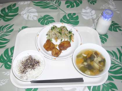 5月14日(月)メニューは、ごはん、ゆかりふりかけ、鶏肉のレモンソースかけ、おひたし(青菜)、豆腐汁、牛乳です。