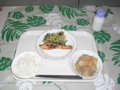 5月22日(火)メニューは、ごはん、鮭の南部焼き、おひたし(菊花)、じゃがいものそぼろ甘辛煮、牛乳です。
