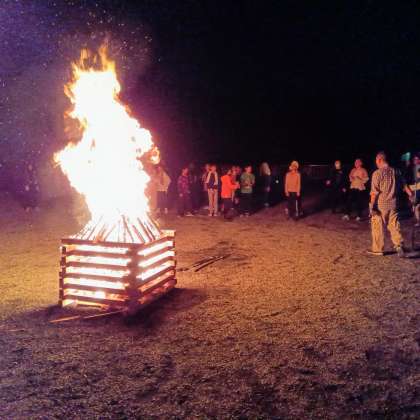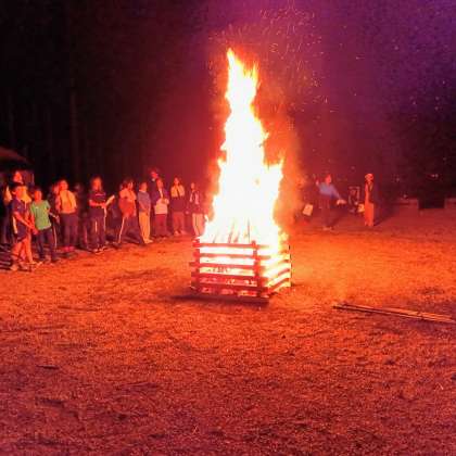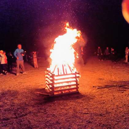 いよいよ川場最後の夜を盛り上げるキャンプファイヤーが始まりました。火の神、カワーバも雨乞山から登場?
