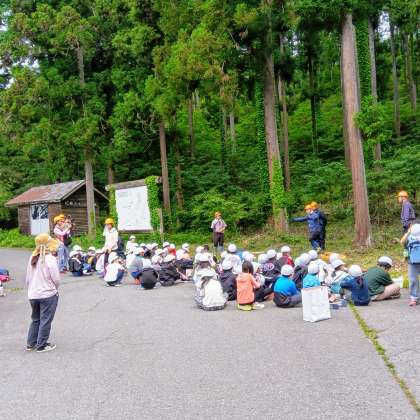全員ヘルメットをかぶり、3グループに分かれて、林業体験を行っていきます。
