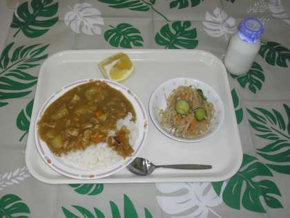 5月29日(火)メニューは、チキンカレーライス、福神漬け、こんにゃくサラダ、美生柑、牛乳です。