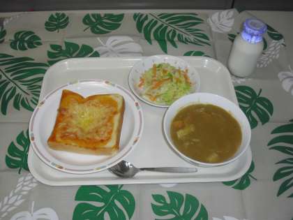 6月6日(水)メニューは、チーズトースト、カレーシチュー、キャベツサラダ、牛乳です。