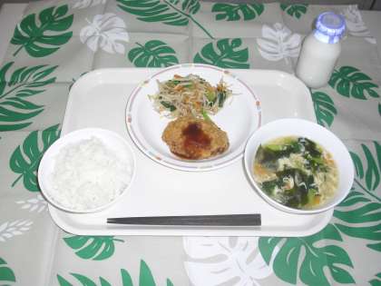 6月11日(月)メニューは、ごはん、コロッケ(ポテト)、野菜のからししょうゆあえ、かきたま汁、牛乳です。