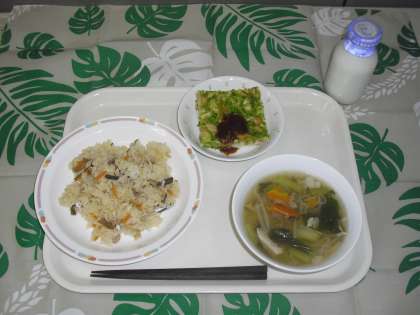 6月12日(火)メニューは、山菜おこわ、沢煮椀、お好み焼き、牛乳です。