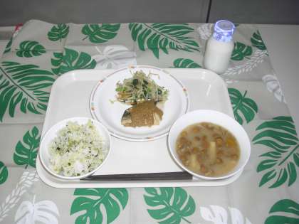 6月19日(火)メニューは、わかめ入り雑穀ごはん、魚のごまだれかけ、おひたし(青菜)、みそ汁(なめこ)、牛乳です。