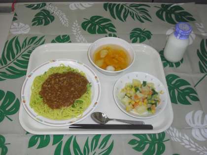 6月26日(火)メニューは、ジャージャー麺、マセドニアンサラダ、フルーツ白玉、牛乳です。