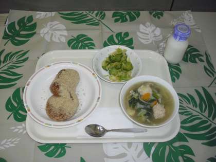 6月27日(水)メニューは、あげパン(白ごま)、白菜と肉団子のスープ、野菜の中華漬け、牛乳です。