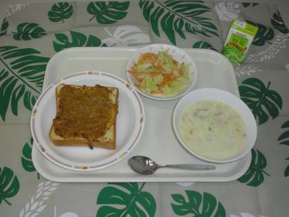 7月11日(水)メニューは、ドライカレートースト、キャベツサラダ、ホワイトグレープキャベツジュース、チャウダーです。
