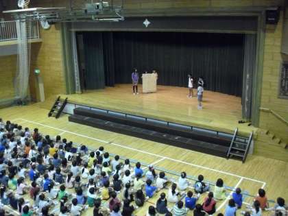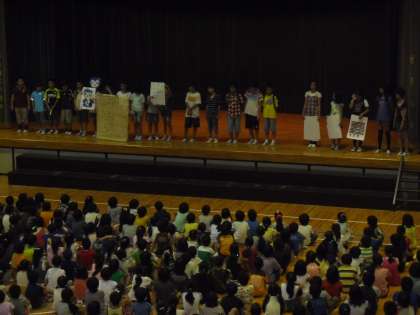 代表委員会による劇とクイズでエコを学びました。どの学年も真剣に見ていました。