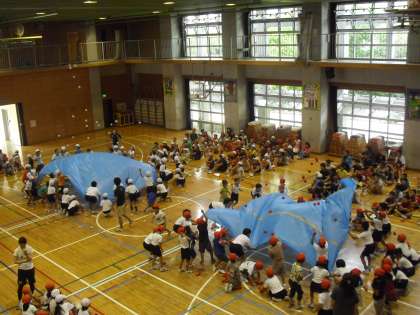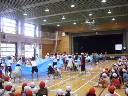 運動委員会の企画で、各学年ごとに赤白に分かれて玉入れをしました。子どもたちが投げる、投シートが舞い上がる・・・最後に残った球を数えて白116、赤149で赤の勝ちでした。
