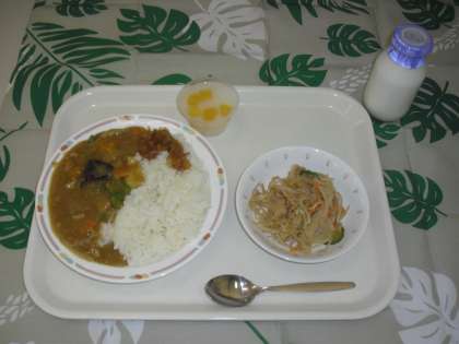 9月10日(月)メニューは、夏野菜のカレーライス、こんにゃくサラダ、ホワイトゼリー、牛乳です。