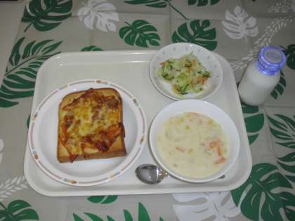9月20日(木)メニューは、ピザトースト、コーンシチュー、キャベツサラダ、牛乳です。