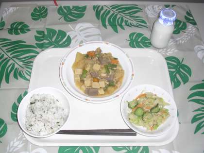 ≪産地≫しょうが・いんげん(千葉)、人参・じゃがいも・玉ねぎ(北海道)、キャベツ・こんにゃく(群馬)、きゅうり(長野)、鶏肉(宮崎)、炊きこみわかめ(韓国)、じゃこ(タイ)、白ゴマ(ガテマラ・パラグアイ・ボリビア)、米(岡山)