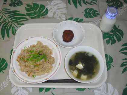 9月27日(木)メニューは、中華おこわ、わかめスープ、さつまいものドーナツ、牛乳です。