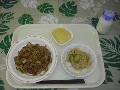 10月2日(火)メニューは、ソース焼きそば、白菜の中華サラダ、マーラーカオ、牛乳です。