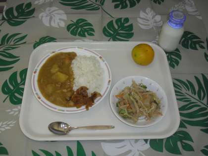 10月9日(火)メニューは、チキンカレーライス、福神漬、こんにゃくサラダ、みかん、牛乳です。