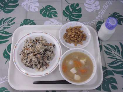 11月15日(木)メニューは、ひじきごはん、いわしのつみれ汁、大豆とじゃこの甘辛揚げ、牛乳です。