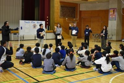 2月14日(金)今日は4年生対象の英語体験出張教室が行われました。体育館にクラスごとに集まり、英語を使ったアクティビティに参加しました。料理や道案内など楽しく活動に取り組むことができました。