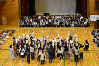 2月28日(金)今日は6年生を送る会です。全校児童が体育館に集まって6年生に感謝の気持ちを伝えました。最初は3年生の出し物で、6年生と計算とけん玉で勝負をしました。(左)次は2年生で、今までお世話になった感謝や卒業のお祝いの気持ちを言葉で表現しました。(中)そして1年生です。1年生は2つの贈り物をしました。一つは金メダル、もう一つは歌と踊りです。(右)