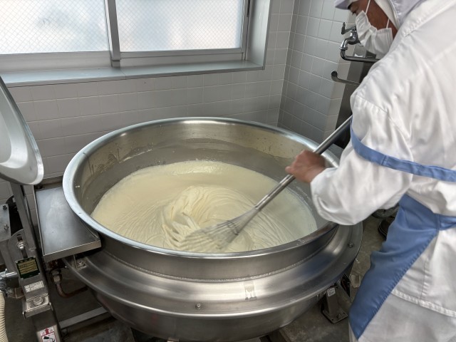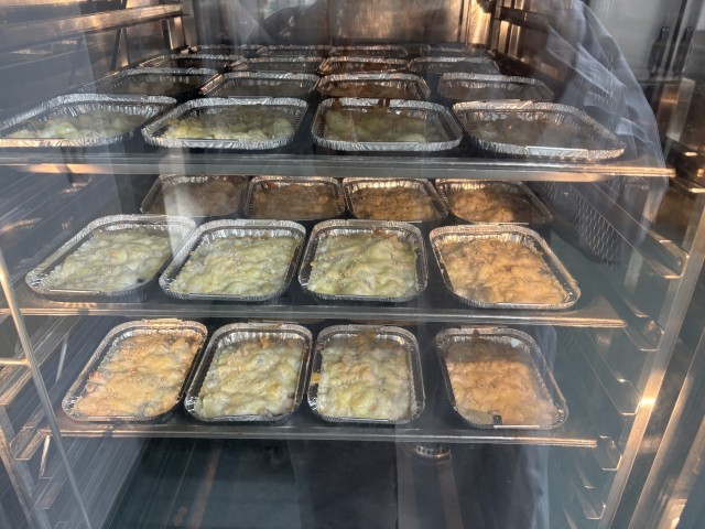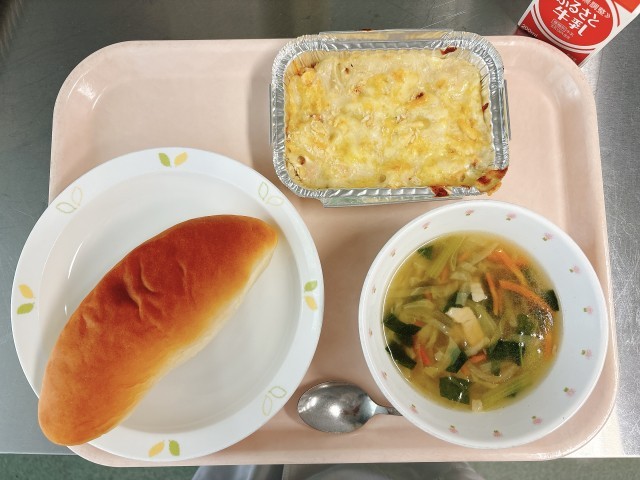 角切りの鮭としめじを使ったポテトグラタンを作りました。2枚目の写真は、ホワイトルーを1から手作りしている様子です。