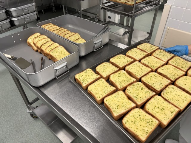 ニンニクとたっぷりのバター、パセリを合わせた生地をパンに塗ってこんがりと焼きました。風味がとっても良かったですね。