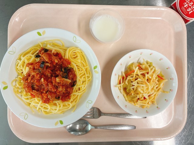 パスタのソースは、みじん切りにした野菜とひき肉をトマト味をベースに味付けして煮込み、素揚げにしたナスを加えました。
