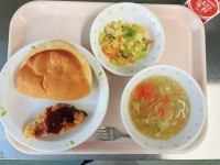 (献立)アップルトーストキャロットソースサラダきのこのクリームスープ牛乳りんごの...
