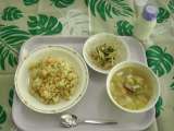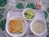 本日のメニュー『チーズトースト・チャウダー・コーンサラダ・みかんジュース』