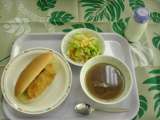 本日のメニュー『セルフフィッシュサンド・コンソメスープ・コーン入りフレンチサラダ・牛乳』