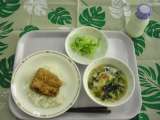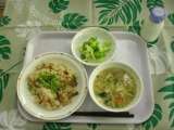 本日のメニュー『ごはん・鶏肉のレモンソースかけ・和風サラダ(もやし)・すまし汁・牛乳』