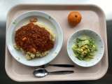 ◆◇今日の献立◇◆ スパゲッティミートソース サウピカンサラダ 牛乳