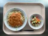 ◆◇今日の献立◇◆ ツナのトマトクリームスパゲッティ マセドアンサラダ 牛乳
