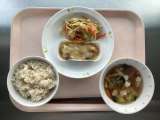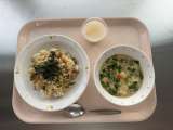 ◆◇今日の献立◇◆ キンパ風混ぜごはん にらたまスープ ピーチ入りホワイトゼリ...