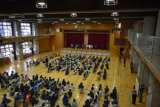 1月26日(土)朝、体育館で集会を行いました。幕の間から何が通るのか3択で答える...